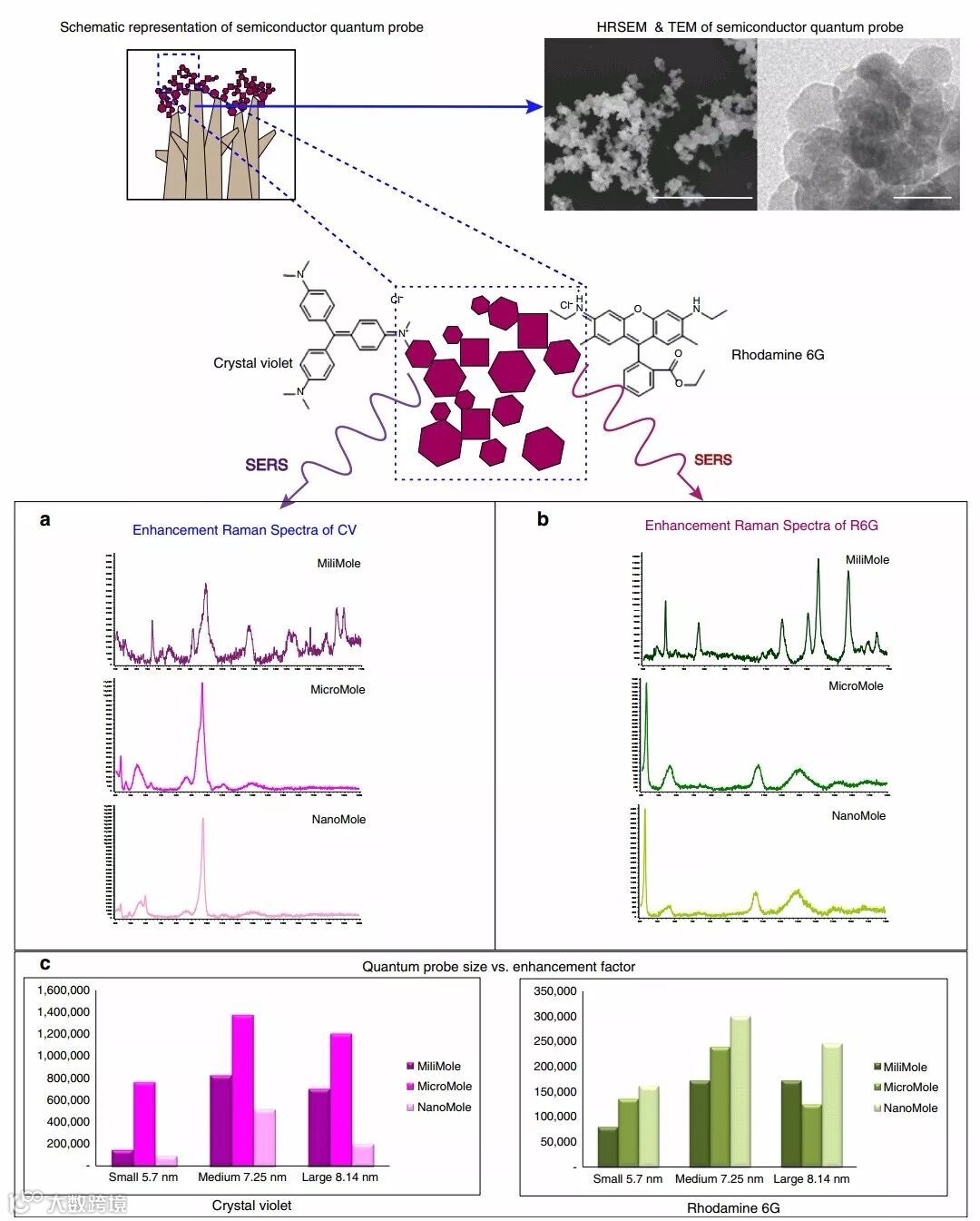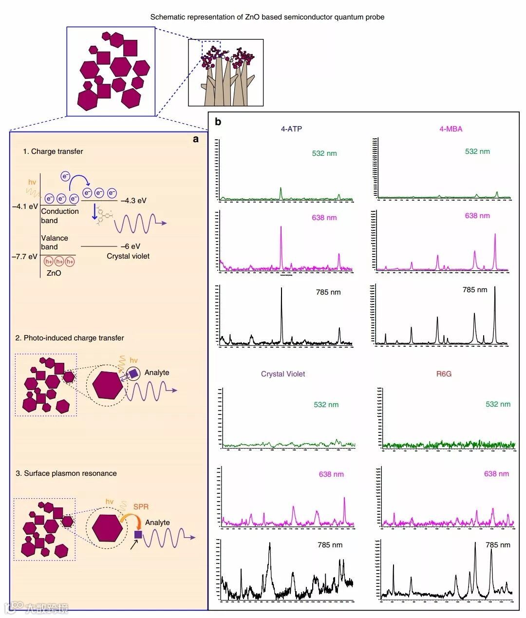(a)基于ZnO的半导体量子探针的SERS增强机制:(1)电荷转移共振;(2)由于量子尺寸导致的近场相互作用,光致电荷转移;(3)单分子半导体量子探针系统中的表面等离子体共振;