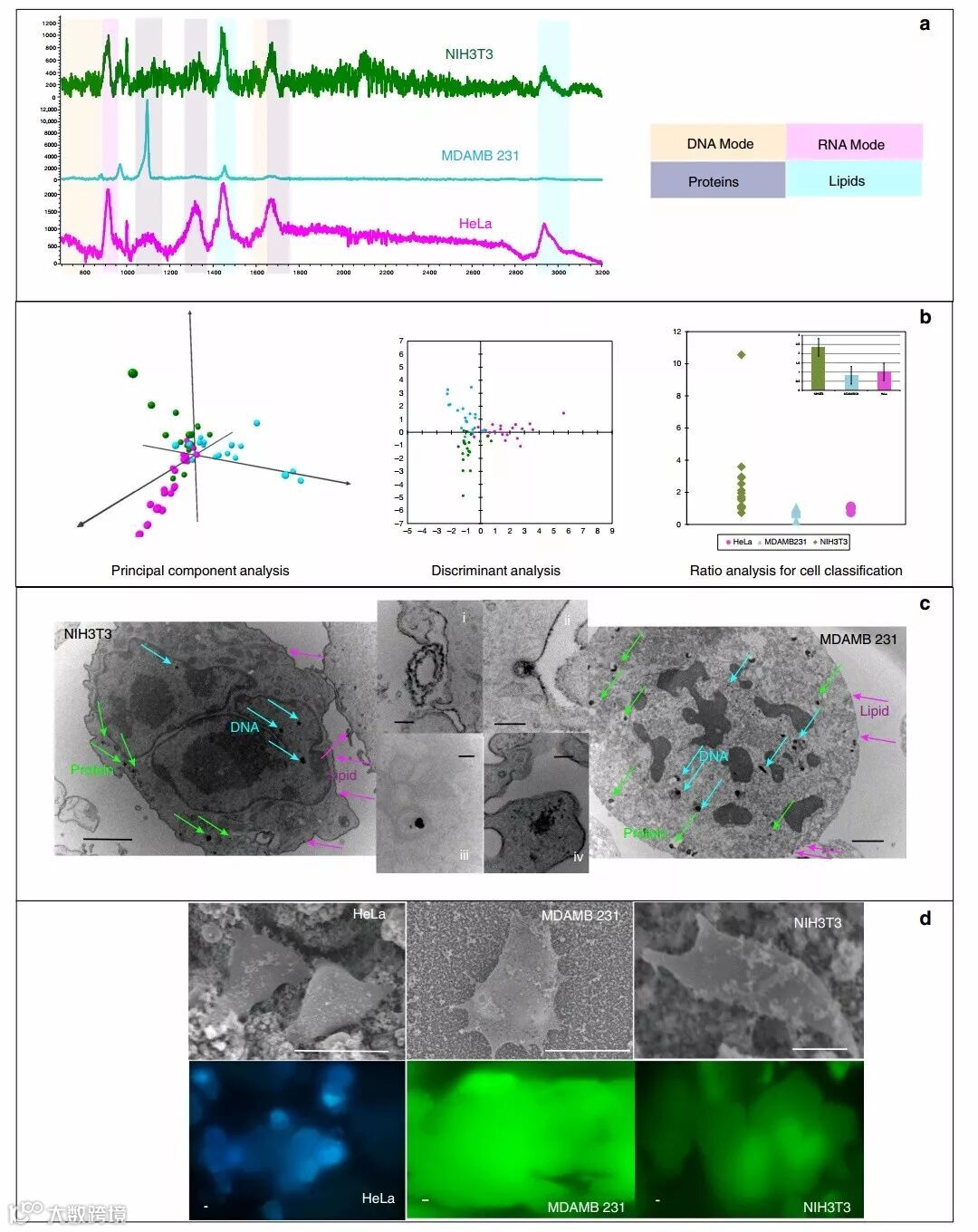 (b)HeLa,(c)MDAMB231和(d)NIH3T3不同时间的SERS光谱, 6 h (i), 12 h (ii), 24 h (iii),和48 h (iv),及主成分分析(PCA)和判别分析(DA)。