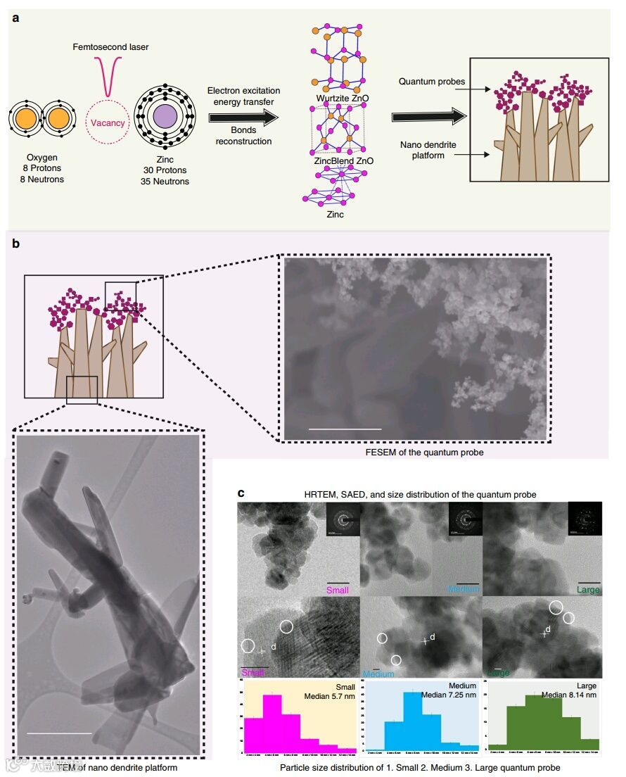 (a) 飞秒激光相互作用下纳米树突细胞粘附基底和基于ZnO的半导体量子探针的制备;