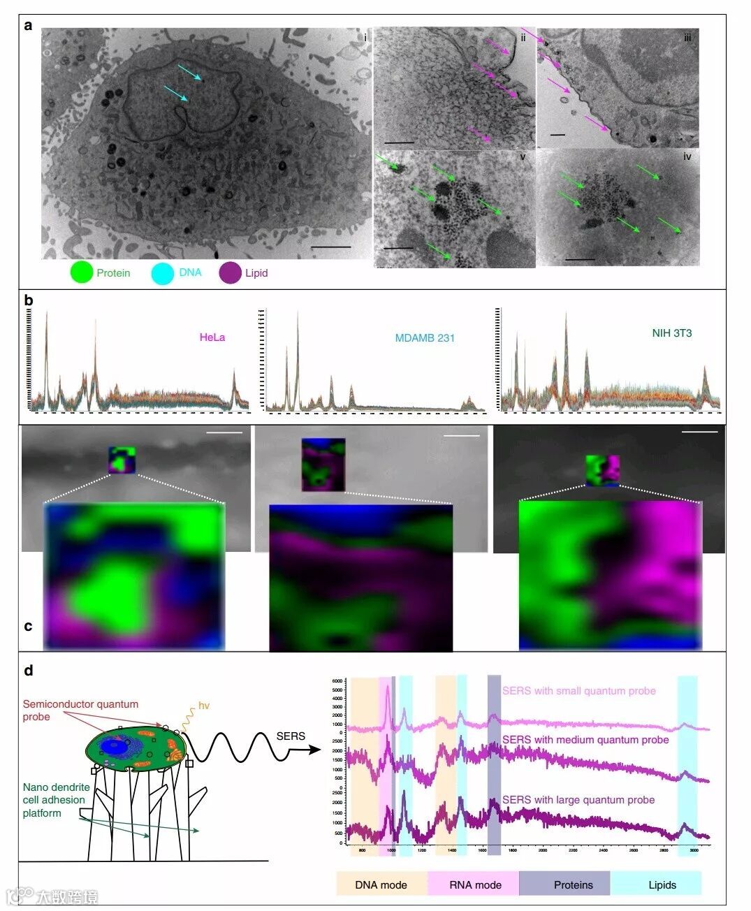 (c)细胞的TEM图,显示出很多量子探针出现在细胞核、细胞质和细胞膜,为DNA,RNA,蛋白质和脂质的体外无标记、同时和多重检测提供了可行方法。