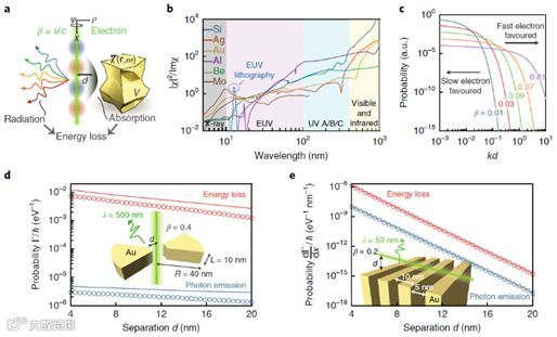 自由电子辐射(Free-electron radiation),如Cerenkov辐射和Smith-Purcell辐射,受到了结构光学环境(structured optical environment)的极大影响,这已经在各种极化子(polaritonic)、光子晶体(photonic-crystal)和超材料(metamaterial)体系中得以证明。然而,从任意材料结构附近的自由电子中所提取的辐射剂量仍然是难以确定的,这给未来自由电子辐射的高效利用带来了障碍。最近,来自美国麻省理工学院、耶鲁大学和以色列理工学院的研究团队通过理论计算,得出了在任意几何形状中的自发光子发射(spontaneous photon emission)和自由电子能量损失的理论上限,同时揭示了材料特性和电子速度的影响。他们在金纳米“领结型”天线和一维金光栅结构中,通过Smith-Purcell辐射的定量测量,获得了支持该理论的实验证据。这一理论框架可以衍生出两个重要预测:其一是新的亚波长分离(subwavelength separation)的辐射操作方式,较慢的电子(非相对论范畴)可以实现比高速电子(相对论范畴)更强的辐射;其二是无损耗材料极限下的辐射概率(emission probability)的差异。进一步研究揭示出这种差异可以通过将自由电子耦合到连续体中的光子束缚态(photonic bound states)来实现。研究结果表明,不需要加载超高的加速电压,就可以实现从微波到软X射线辐射的紧凑、高效的自由电子辐射源。相关研究发表在近期的《Nature Physics》上。