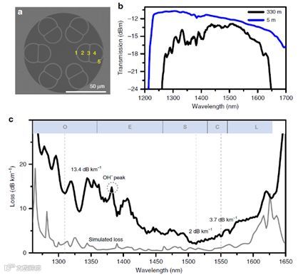 当前,以5G技术为代表的信息爆炸时代方兴未艾,人们对高带宽、大容量的数据传输需求日益增长,迫切需要发展下一代的光纤通讯技术。其中,人们希望信息通道——光纤能够最大限度地减少非线性损失和色散,并使得信号发射功率最大化,以满足长距离、大数据量的通信要求。近年来,空芯光纤(Hollow-core fibre,HCF)能够突破传统光纤中的非线性Shannon极限,并满足上述所有的性能提升需求;但是,在将其考虑用于大容量通信系统之前,其光学性能需要得到进一步的优化升级。最近,来自北京工业大学的汪滢莹副研究员、王璞教授等人领导的科研团队,联合中科院物理所的研究人员报道了一种新型空芯光纤,其光纤包层中具有互联管道(conjoined-tube)和负曲率的光芯形状。经特殊结构设计的光纤在1512 nm处的最小传输损耗为2 dB/km,在跨越O/E/S/C/L通信波段(1302-1637 nm)中的带宽展宽(bandwidth spanning)<16 dB/km。该空芯光纤具有超低损耗、宽带宽、低弯曲损耗、高模式质量和简单结构等综合优势,在下一代的通信技术中将有可能发挥巨大的应用价值。相关研究发表在近期的《Nature Communications》上。