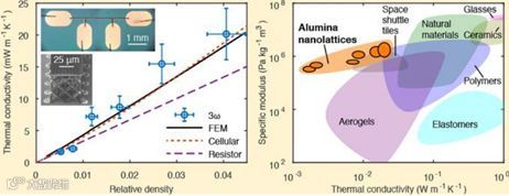 在材料科学领域,“鱼和熊掌不可兼得”这样的案例屡见不鲜,不同性能之间的关联和矛盾往往成为制约材料大规模应用的关键因素。例如,在隔热保温中有着重要应用的多孔材料具有较低的热导率(thermal conductivity),但是往往也具有较差的弹性模量(elastic modulus),不利于其在实际应用场合中的力学强度需求。因此,创造出同时具有超低导热性、高刚度和损伤容限(damage tolerance)的材料是具有挑战性的,但也具有具有的实际应用价值。纳米晶格(Nanolattices)具有分层设计(hierarchical design)和纳米级特征,在一定程度上可以填补上述的“属性盲区”。近日,来自美国加州理工学院的Austin J. Minnich课题组报道了一种octet-truss结构,它是由24-182纳米厚的空心氧化铝梁结构组成,在室温下实现了低至0.002 W/(m·K)的超低热导率,同时保持了0.3-3 MPa kg-1m3的比强度(specific stiffness),还具有从大的变形中恢复的奇特能力。这些纳米材料具有与气凝胶相同的超低热导率,同时获得了高出近2个数量级的比弹性模量。这一研究工作展示了该材料体系实现多功能材料的途径,达到了常规材料属性所不具备的综合优化性能。相关工作发表在近期的《Nano Letters》上。