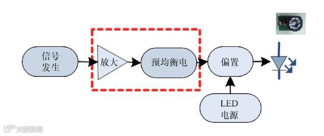 采用后端均衡技术,同样可以拓展可见光通信系统带宽。用3dB调制带宽为12 MHz的LED器件作为光源,发送端不做预加重处理,仅在接收端使用有源均衡处理,该系统3dB调制带宽可以拓展至151MHz,系统实时传输速率为340Mb/s。可见光通信系统结构如图5所示。