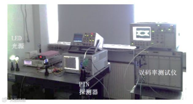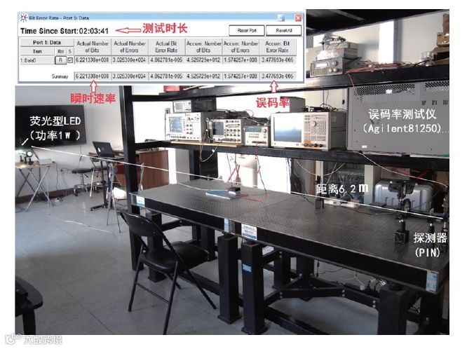 2014年,本研究组将可见光通信系统的预加重技术和后端均衡技术结合,搭建了实时高速率可见光通信演示系统。该系统采用采用1 W功率的荧光型白光LED,驱动电流为300 mA,传输距离为1.6 m 时,系统3dB带宽233 MHz,因为系统调制带宽被大幅拓展,故采用OOK-NRZ调制方式就能实现较高速率的实时传输。数据传输速率为500 Mb/s、传输距离为1.6 m时,经安捷伦误码率测试仪81250在线误码率测试,1 h的平均误码率为1.6×10-6,原始误码率远小于3.8×10-3这个前向纠错对误码率的门限要求。2015年,该系统通过优化设计(图6),委托工信部泰尔实验室来进行测试认证,1 W的荧光型LED和PIN探测器间距离6.2 m,平均速率610 Mb/s,安捷伦误码率测试仪测出的2 h平均误码率为3.48×10-5。