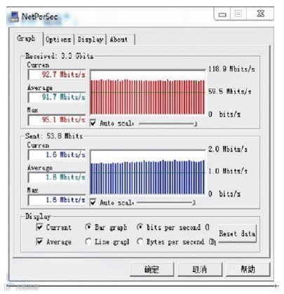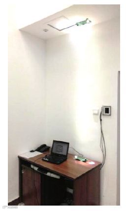 2015年,基于可见光通信系统的带宽拓展技术,利用荧光型LED和PIN探测器作为无线光通信的光源和探测器,本研究组研发了双向对称100Mb/s的上网演示系统,该系统安装在光学平台上,传输距离2.4 m时平均下载速率约90Mbps。安装到实验室写字台顶上的天花板上后(图7),传输距离1.9 m,下载速率如图8所示为91~95 Mb/s。
