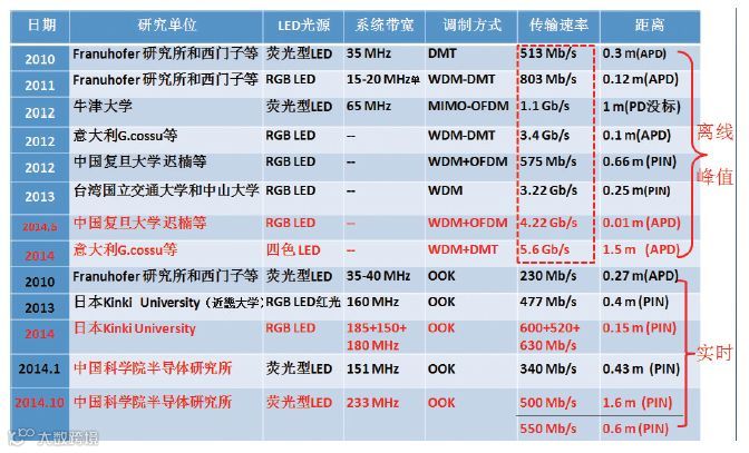 表1中,红色字体的4个代表性成果分别是2014年RGB三色LED系统离线处理最高峰值速率、红绿蓝黄四色LED系统离线处理最高峰值速率、RGB三色LED系统实时传输最高速率和荧光型LED系统实时传输最高速率。对于可见光通信系统,表征其通信性能的关键指标是传输速率、距离和误码率,这3个指标相互制约,相互影响。当然还可以同时考虑功耗、价格、尺寸等因素。光源、探测器、调制复用技术是决定可见光通信系统通信性能的主要因素。对于可见光通信技术研究进展的意义和重要性,应综合考虑以上这些因素。