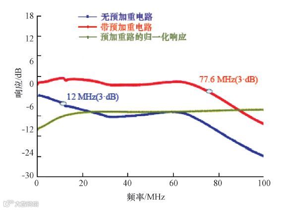 利用预加重技术,可提高可见光通信系统的3dB带宽和数据传输速率。2013年,本研究组设计了带预加重网络的可见光通信系统(图1),其中预加重电路的硬件如图2 所示。系统采用功率为1 W 的荧光型白光LED,驱动电流为200 mA,通信距离为1.1 m,通过预加重技术将系统的3dB带宽从12 MHz提高至77.6 MHz(图3);数据传输速率为200 Mbps,系统误码率小于1×10-6(图4)。