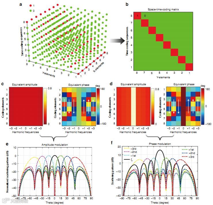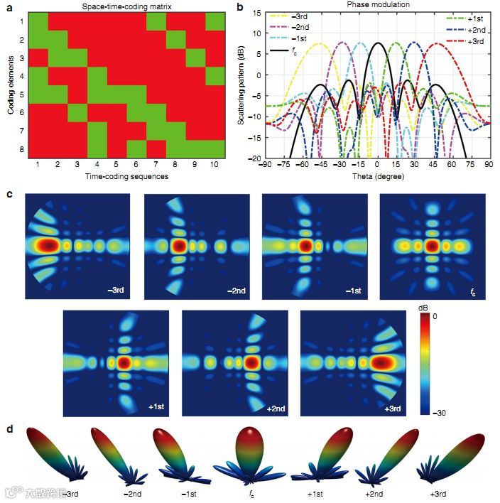通过向PIN二极管施加控制电压,动态地控制表面元件的反射系数,实现具有离散的相位或幅度状态。在所示的示例中,根据数字“0/1”时空编码矩阵周期性地切换每个编码元件的反射相位,这可产生等效的多位时空编码,例如“0”,“1”,“2”和“3”。 这种编码方法可以精确控制空间和频域中的EM波。