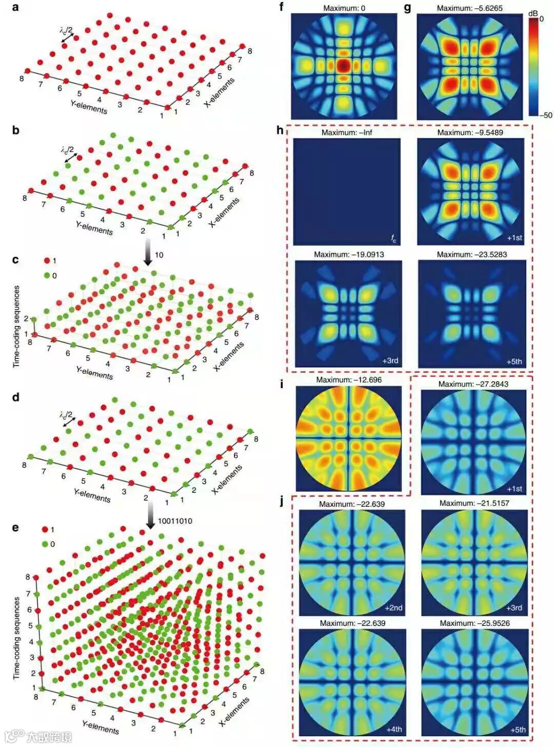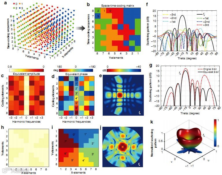 j不同谐波频率的时空编码数字超表面图(e)的二维散射图。