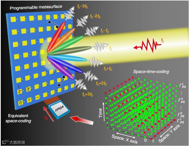 然而,现有的数字编码仅利用了相位的辐角部分,并没有体现出相位编码的全部特性,而对相位编码序列的运算研究也仅限于数字序列的标量叠加,限制了数字编码超材料的多功能应用前景。并且,在上述数字可编程架构中,人们往往迄今仅考虑空间编码,尚未利用时间这一维度,即编码序列通常在时间上是固定的,并且仅由控制系统改变,以便根据需要随时切换功能。以往的研究提出了超表面的时间调制,但这些理论方法主要是基于模拟调制,很难用于实际应用中。作为另一种可行的途径,本研究中引入了“时空编码”的概念来扩展基于超表面的电磁波操纵。