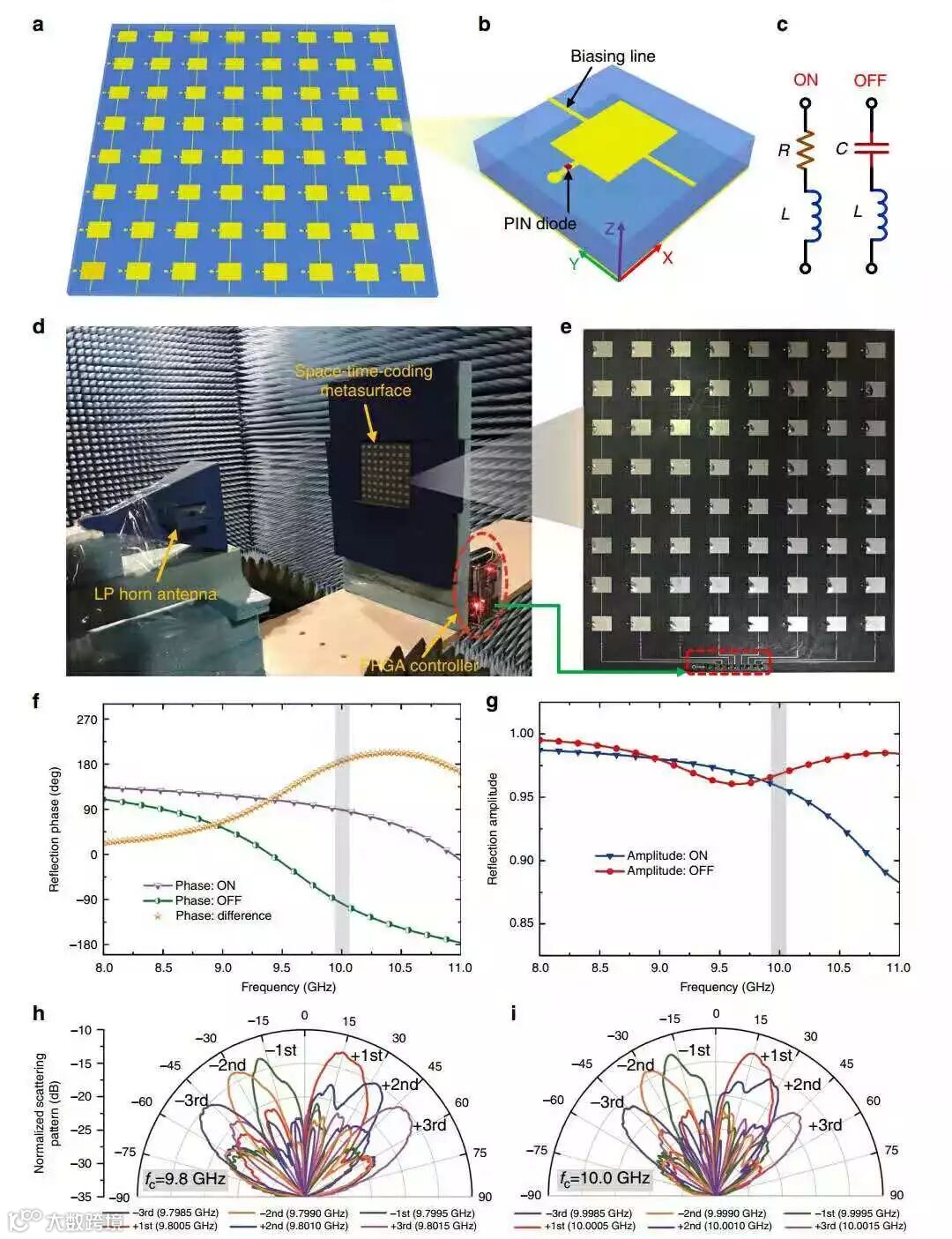 f,g数值计算了编码元件的反射相位和幅度,两个二极管状态与频率的函数关系;