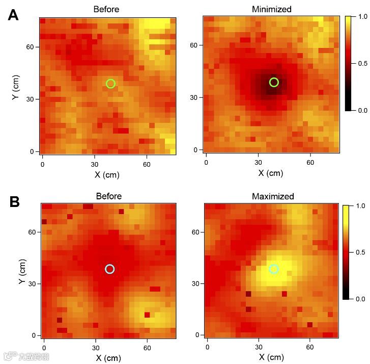 图3 优化前后的声场对比。A中优化目标是降低声强,实现静音区;B中优化目标是增加声强,产生强场区。