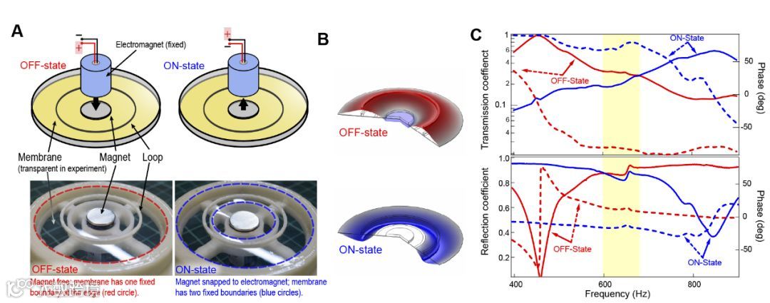 为了实现该目标,我们首次研制了针对空气中声波的空间声场调制器(spatial sound modulator)。如图1所示,空间声场调制器基于声波超界面(acoustic metasurface),由360个相同的薄膜型共振器构建2,其总面积约两平方米(小于室内边界表面积的1%)薄膜型共振器的结构,如图2A、B所示。通过设计,共振器的共振频率可以通过直流电压调控,在450Hz和850Hz之间来回切换。这样,在600-700Hz,我们有效实现了对透射声波相位的二元调控(图2C)。与此同时,我们通过计算机对调制器进行编程,并通过实时反馈和递归优化手段实现了对混响声场前所未见的调控:图3A中,我们通过对空间声场调制器的优化,在室内指定位置构建出“静音区”(暗色区域),这一区域内的声强能够明显降低。同样,我们也能够实现“强场区”的产生,如图3B所示。研究表明:该效应对混响场内任意位置以及600-700Hz内的任意工作频率都是有效的,同时对宽频也具有一定的效果。