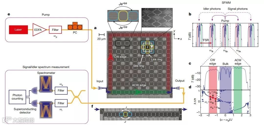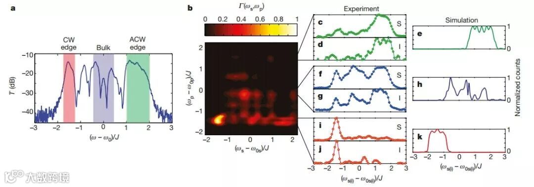 为了在该系统中生成关联光子对,作者使用了硅的三阶非线性并实现自发四波混频过程。在实验中使用了可调谐连续波激光器来泵浦晶格纵向模式,从而能够测量产生的光子光谱。图2描述了耦合共振波导阵列的透射谱实验测量结果,以及单光子信号强度随泵浦频率变化的函数Г(ωS,ωP)。对于连续波泵浦,函数Г(ωS,ωP)等效于关联光谱强度,通常用以表征所产生的光子之间的光谱相关性。当晶格在顺时针边界态中泵浦时,在频率为ωp-ω0p≈-1.5J处会产生最多的光子数(图2i),同时信号光的场分布主要集中在顺时针边界态模式之中。同时由于能量守恒原理,闲频光子也表现出以顺时针边界态频率为中心的窄带光谱分布。边界态中关联光子对的增强和光谱局域是边界态线性色散的结果,其自然地满足相位匹配条件。当晶格在逆时针边界态中泵浦时,也可以观察到类似的局域化关联光子对的产生(图2c-e)。只是由于在逆时针边界态模式中,从输入到输出端口的传播距离要比顺时针边界态模式短得多,因此产生的光子强度要弱得多。与边界态模式相比,体模式没有良好的线性色散特性,因此不满足相位匹配条件,因而SFWM效率低。并且由于体带不具有拓扑保护的性质,受加工缺陷和误差的影响,整个体态泵浦的结果与模拟结果不匹配。而边界态的观测结果和模拟结果之间具有较好的一致性,这也侧面佐证了拓扑保护的边界态具有抵抗杂质缺陷的鲁棒性。