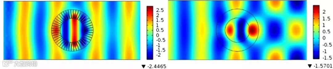 左图为FP谐振集中器模型,右图为无FP谐振集中器模型对应的水波振幅场图,并且从不同振幅水波入射至FP谐振集中器,中心点水波振幅也有所不同。