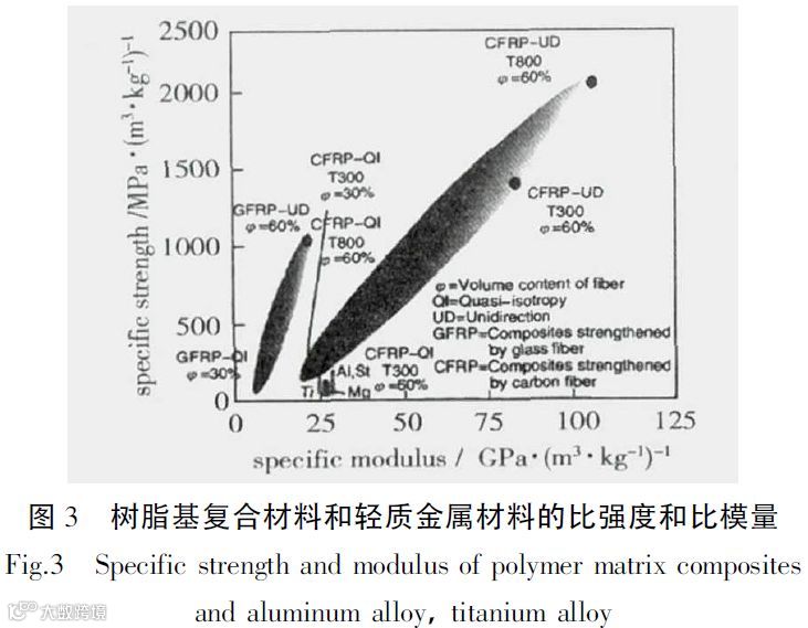 树脂基复合材料是以聚合物为基体,纤维为增强体复合而成[11]。因此,树脂基复合材料的用量已经成为衡量航空航天技术发展的重要标志。图3 为树脂基复合材料和轻质金属材料的比强度和比模量。