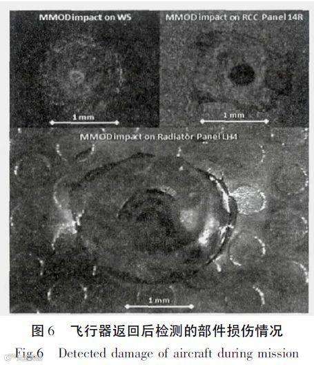流星体是指存在于太阳系内高速运转的固体颗粒。而碎片是指宇宙空间中除正在工作的飞行器以外的人造物体。航天飞行器在这样的环境中运行,损伤难以忽视,如图6 所示[19]。因此,碎片问题不仅是设计和发射航天器时必须考虑的一个因素,也是维护空间环境安全的一个重要方面[20]。