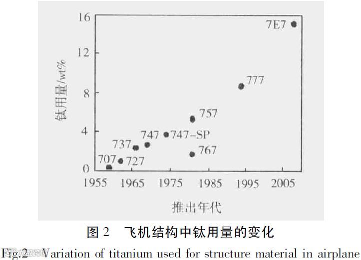 图2 是飞机结构中钛用量随年代的变化[7]。由于其价格昂贵,常用于承力大的关键部位。为扩大钛合金的使用量,国外积极研制新型低成本钛合金。美国Allegheny 技术公司也采用铁元素代替钒元素和富氧技术,研制了新配方Ti-4Al-2.5V-1.5Fe-0.25O钛合金,其性能类似于Ti-6Al-4V 合金,具有优良的冷成形和热加工性能,但价格比航空航天用的Ti -6Al-4V 合金约低20%。