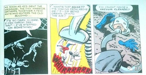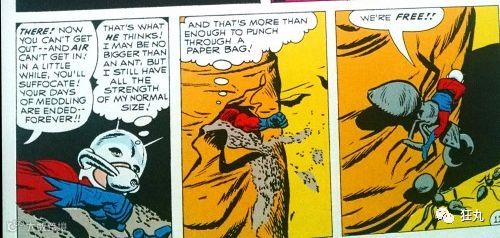 他首先确定了一点:那就是蚁人的密度始终没变,这也就意味着质量一定是随着身体一起缩小的。例如在《惊异故事》第37期中,蚁人因为质量小而被吸入吸尘器,另外他还能乘骑老鼠。