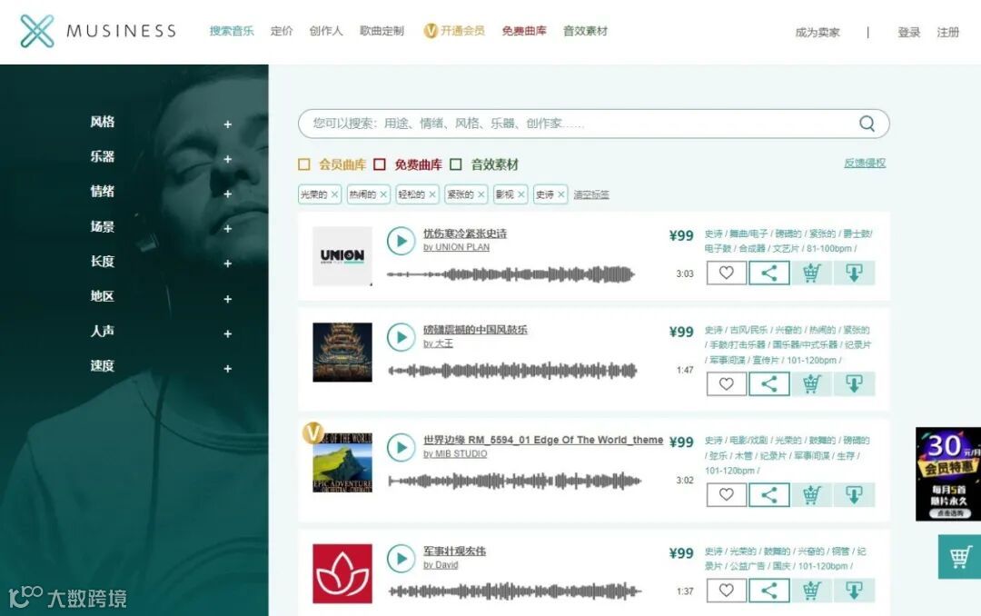 MUSINESS音乐素材网(www.musiness.vip),2022年度广告门指数代理公司年度TOP100、设计制作代理公司TOP10、中国国际广告节-广告主金伙伴百强企业。聚合了约300,000首优质大牌音乐、配乐、音效曲库及配音cv声展区,含数百位好莱坞音乐制作人作品,是世界经典名曲《班得瑞》全部15张专辑在中国大陆地区的独家授权代理。广告配乐、短视频背景音乐、元宇宙空间环境音乐、影视配乐、游戏BGM、动漫BGM等需求均可在MUSINESS音乐素材网中依据标签和关键词搜索下载,并获得音乐授权使用证书。MUSINESS音乐素材网开放了部分免费音乐曲库,让用户尽情享受正版音乐商用的自由。