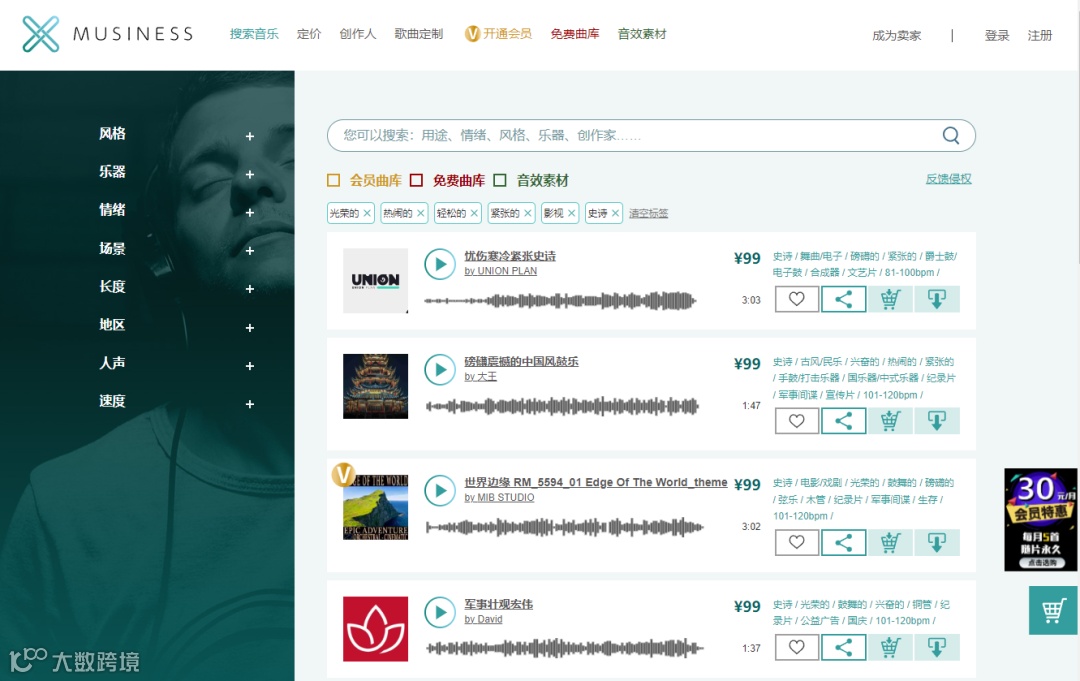 MUSINESS音乐素材网(www.musiness.vip),2022年度广告门指数代理公司年度TOP100、设计制作代理公司TOP10、中国国际广告节-广告主金伙伴百强企业。聚合了约300,000首优质大牌音乐、配乐、音效曲库及配音cv声展区,含数百位好莱坞音乐制作人作品,是世界经典名曲《班得瑞》全部15张专辑在中国大陆地区的独家授权代理。广告配乐、短视频背景音乐、元宇宙空间环境音乐、影视配乐、游戏BGM、动漫BGM等需求均可在MUSINESS音乐素材网中依据标签和关键词搜索下载,并获得音乐授权使用证书。MUSINESS音乐素材网开放了部分免费音乐曲库,让用户尽情享受正版音乐商用的自由。