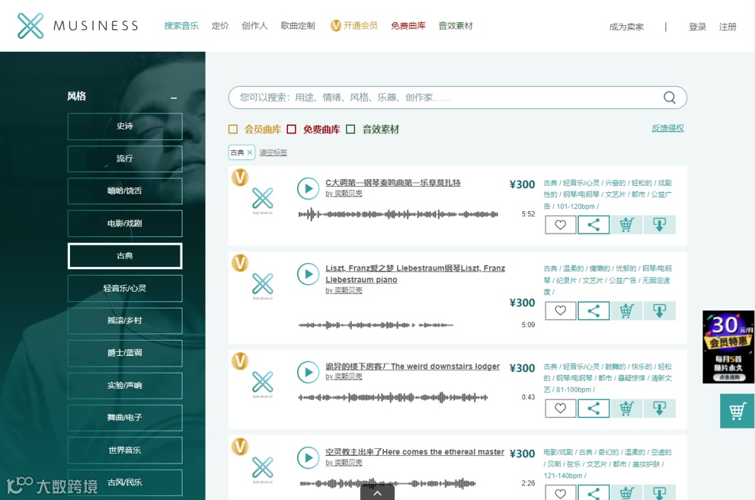 专注版权音乐的授权与交易,MUSINESS音乐素材平台聚合了约300,000首优质大牌音乐、配乐、音效曲库,含数百位好莱坞音乐制作人作品,是世界经典名曲《班得瑞》全部15张专辑在中国大陆地区的独家授权代理。广告配乐、短视频背景音乐、影视配乐、游戏BGM、动漫BGM等需求均可在MUSINESS曲库中依据标签和关键词搜索下载,并获得音乐授权使用证书。MUSINESS还开放了部分免费音乐曲库,让用户尽情享受正版音乐商用的自由。