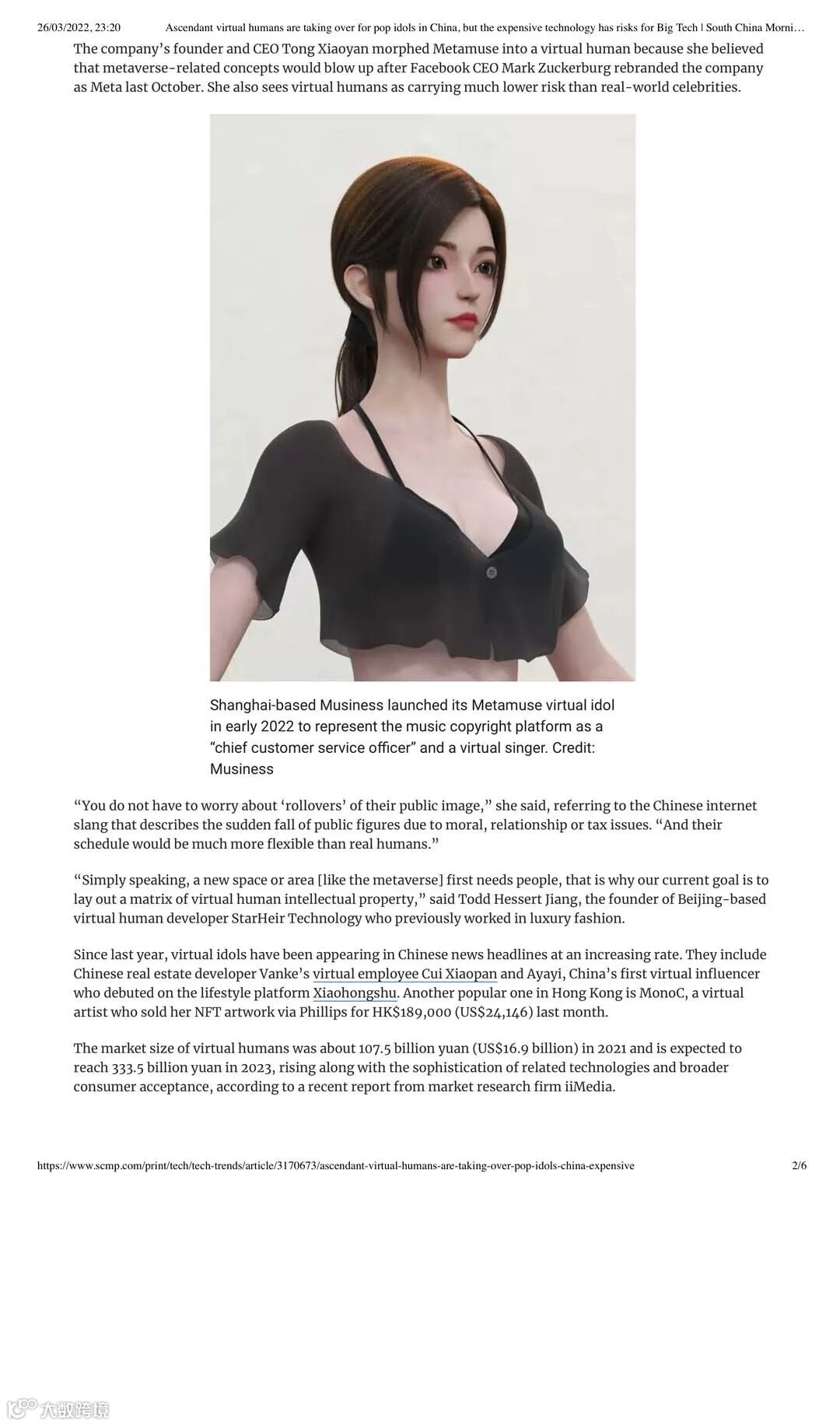 超写实虚拟歌手“小缪Metamuse”于2022年2月出道,出道不久后便成为品牌代言人及形象大使,并登上香港销量最高的英文报纸《南华早报》,两次登上微博热搜。