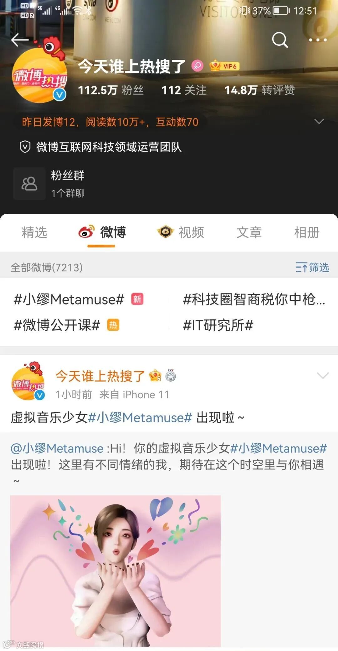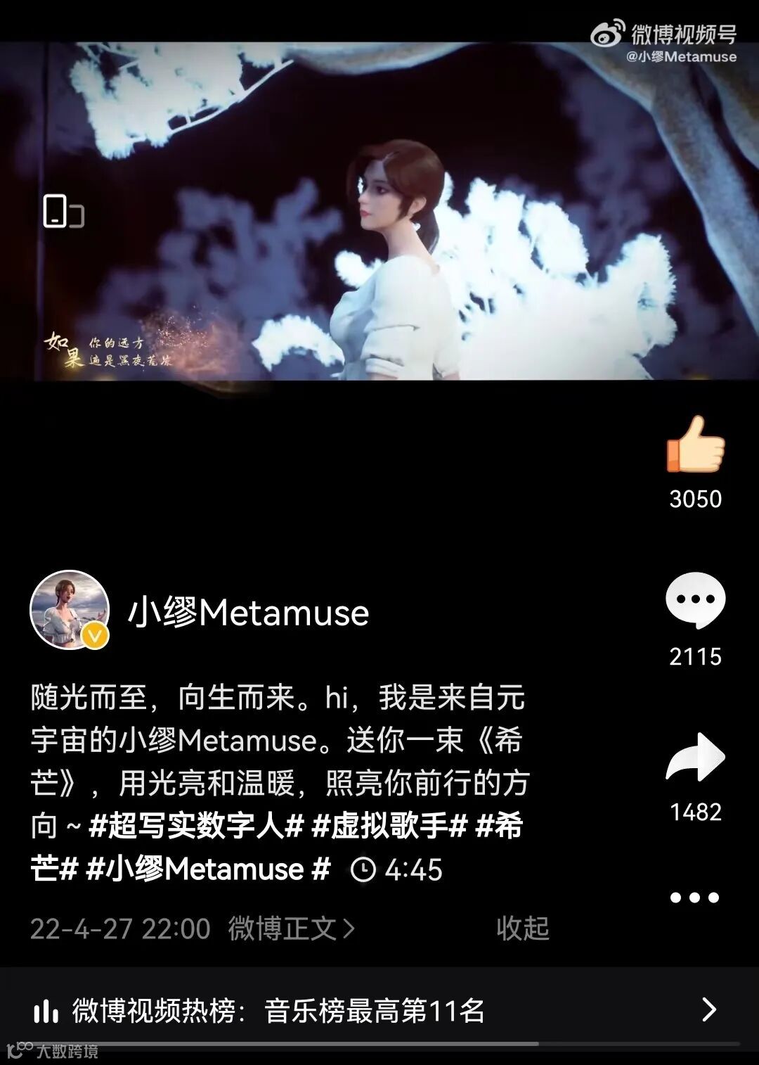登微博热门视频「全站总榜」和「音乐榜」第11位!