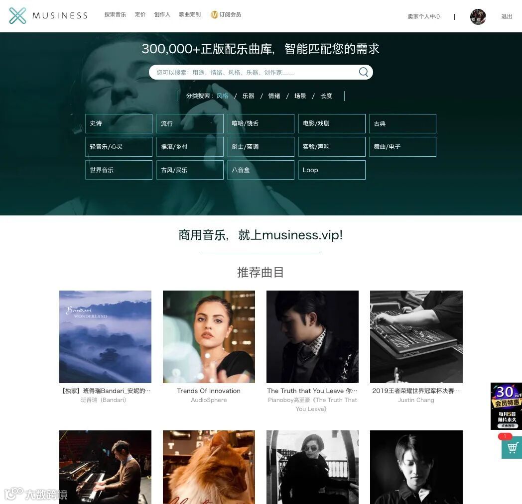 广告制作、短视频制作、影视制作、游戏制作、动漫制作等用户可在musiness.vip平台上依据标签和关键词搜索,购买下载所需配乐BGM,并获得音乐使用授权证书。用户也可订阅会员,包月使用正版音乐与配乐,只需30元/月即可在约8万首曲库中下载使用5首正版音乐与配乐,获得随片永久授权。