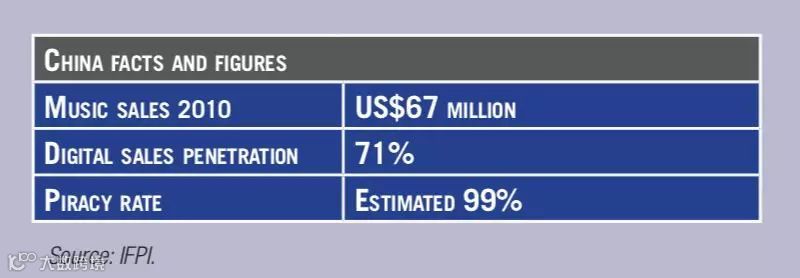 IFPI在2012年的《数字音乐报告》(Digital Music Report)提到中国音乐市场的盗版率估计是99%。从盗版率99%到96%正版消费,分析原因政策和市场缺一不可。
