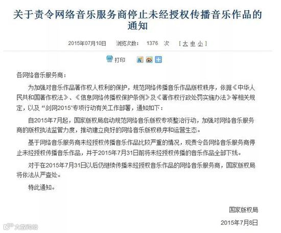 2010年12月14日,文化部发布通知,决定进一步清理整治违规网络音乐网站,开启了中国音乐正版化的道路。