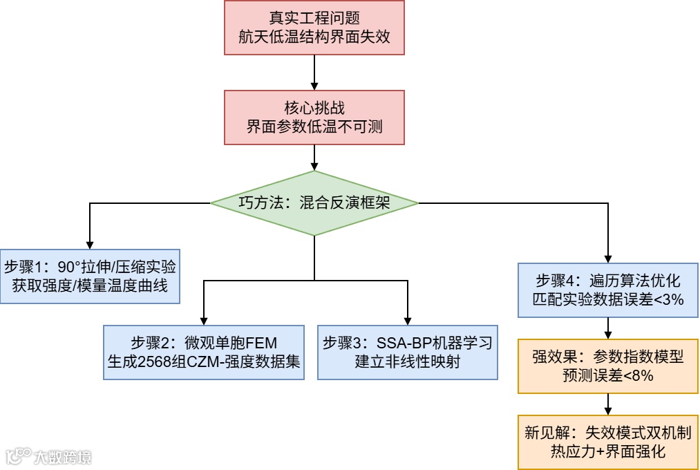 这篇论文发现了一个关于碳纤维/环氧树脂复合材料(CFRP)低温界面强度参数无法直接测量的真问题。该问题的核心硬挑战在于传统实验方法在低温环境下的技术局限与高昂成本。为了攻克这一挑战,作者提出了集成多尺度有限元建模、机器学习和遍历算法的反演框架这一巧方法。该方法取得了预测误差<8%、首次捕捉指数级参数增长规律的强效果,最终为我们带来了低温转变复合材料失效模式双机制控制的新见解。
