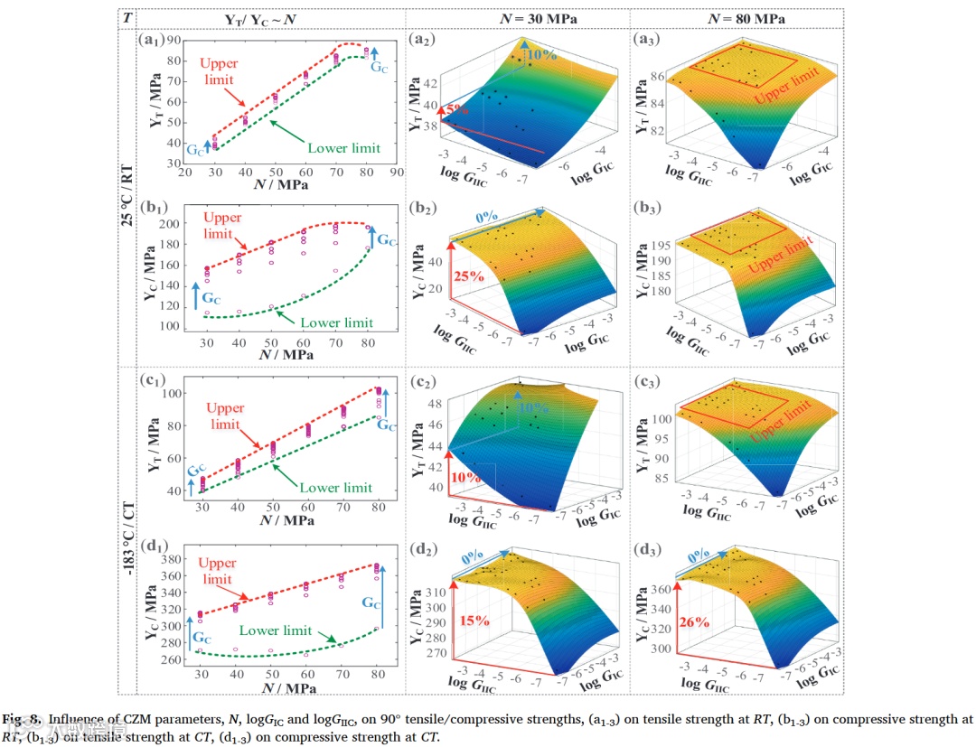 • 强度预测误差≤7.7% • 首次量化界面参数的指数增长规律(如GIIC从5→100 J/m²) • 精准捕获失效模式转变 |