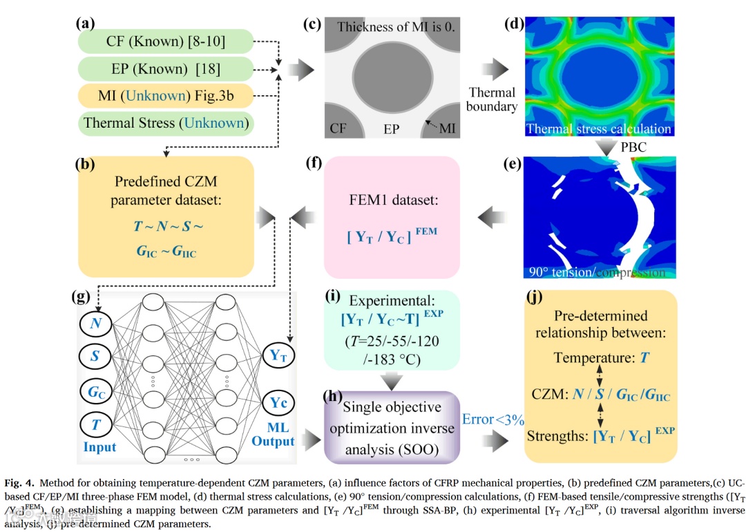 1. -183°C~25°C实验显示强度/模量提升32.9-91.7%; 2. 微观单胞模拟生成温度-CZM-强度数据集; 3. 训练SSA-BP网络建立映射; 4. 遍历算法反演CZM参数(误差<3%)。模型预测误差<8%,揭示界面参数指数增长及失效模式转变机制。 |
