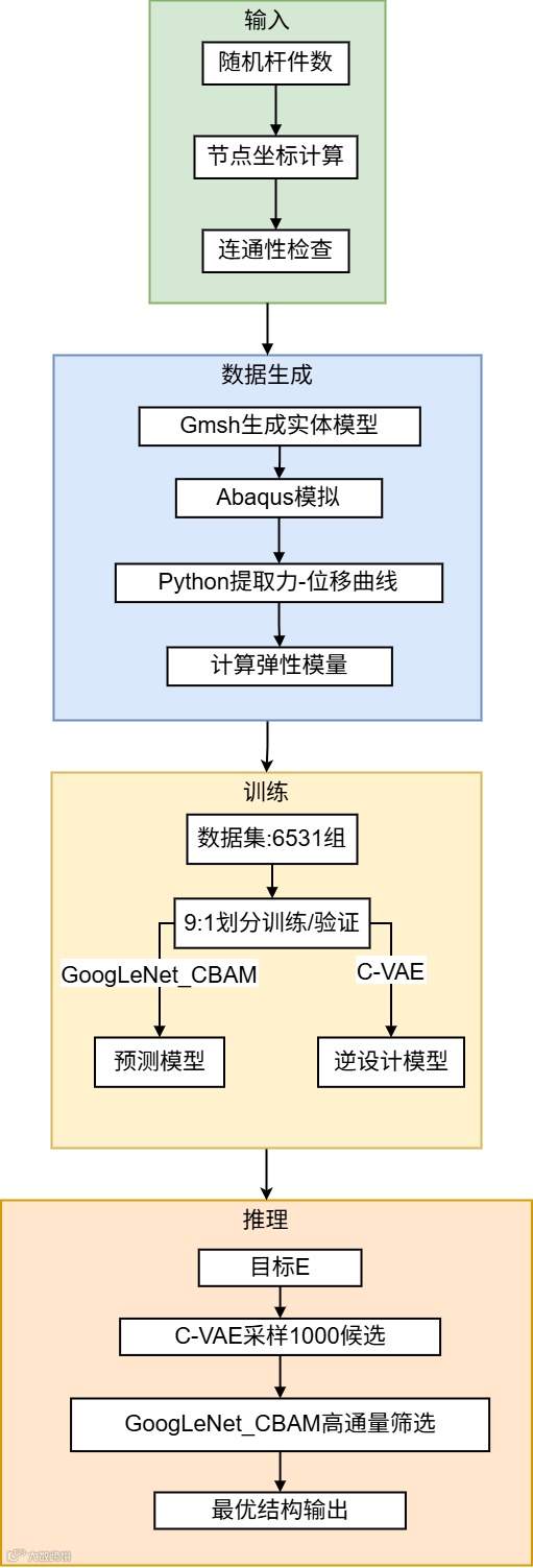 1. 自动化流水线模板:Python + Gmsh + Abaqus 批处理框架,适配任意参数化结构。 2. 正逆解耦训练:预测网络(GoogLeNet_CBAM)独立于C-VAE,可按需替换为PINN等。