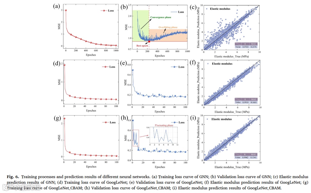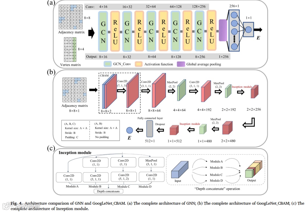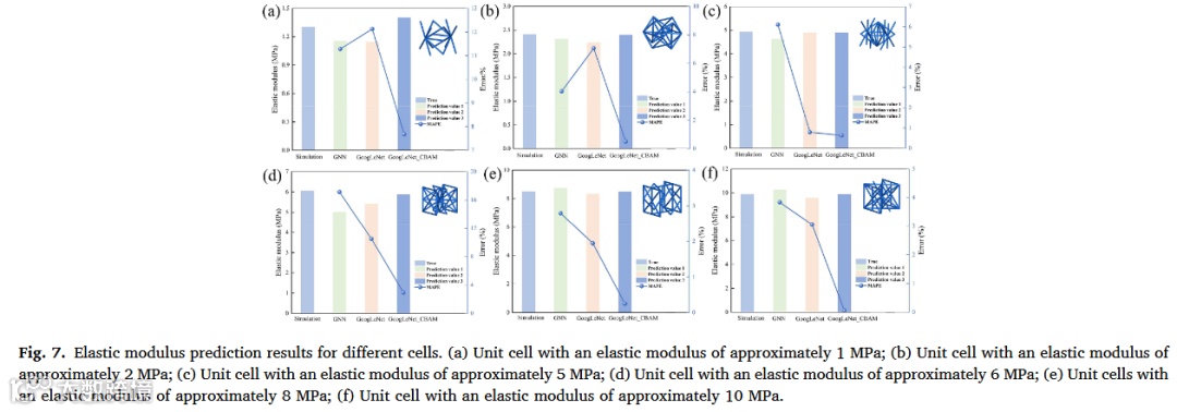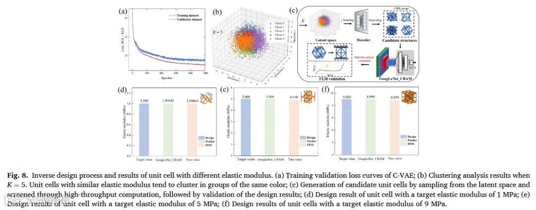 • 正向预测:通过改进GoogLeNet网络(嵌合CBAM注意力机制),直接从连接矩阵预测弹性模量,抑制冗余信息干扰。 • 逆设计:结合条件变分自编码器(C-VAE)与潜在空间聚类学习,实现“目标性能→结构生成”。