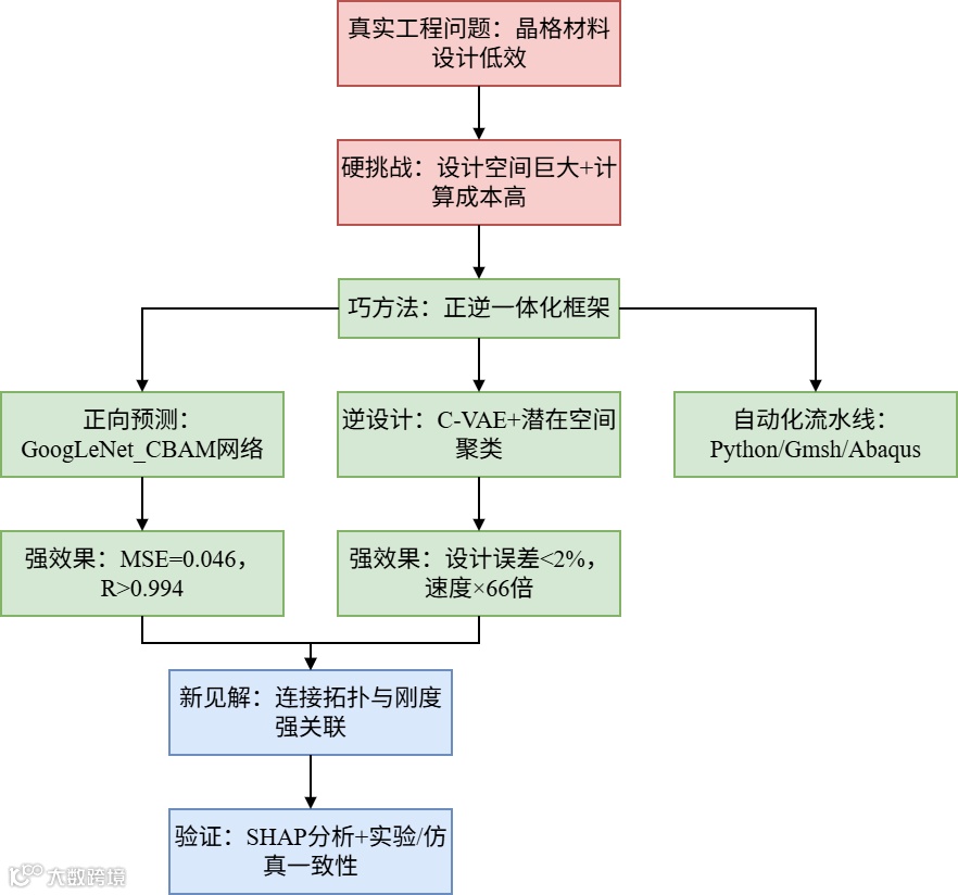 • 数据生成瓶颈:构建高质量仿真数据集需巨量计算资源(单次有限元模拟耗时小时级)。 • 泛化性局限:现有机器学习模型难以统一处理复杂拓扑表征(如连接矩阵),易过拟合。 • 逆设计映射难:从性能目标到结构构型的多对一映射高度非线性,传统优化方法效率低下。 -