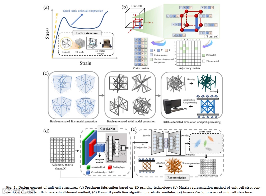 • 摘要翻译: 本文提出一种数据驱动框架,融合自动化几何建模与高通量有限元模拟,实现晶格单元的正向性能预测与逆设计。通过高效工作流生成涵盖多样桁架拓扑的仿真数据库,经3D打印原型与准静态压缩试验验证。训练改进的GoogLeNet_CBAM网络预测弹性模量,精度(MSE=0.046, R>0.994)优于图神经网络(GNN)且抑制过拟合。基于此,引入条件变分自编码器(C-VAE)学习拓扑特征与力学性能共嵌的低维潜在空间。PCA与K-means聚类揭示了杆件连接性与结构刚度间的内在关联。最终,结合C-VAE与预测模型实现高通量逆设计策略,生成满足目标弹性模量的单元(设计误差<2%),计算设计时间仅需10秒,比传统拓扑优化快66倍。