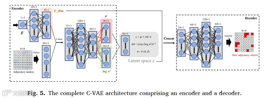 • 编码器:连接矩阵 与模量 拼接 → 全连接层 → 输出潜在参数 。 • 重参数化: ( ),解决采样不可微问题。 • 解码器: 与 拼接 → 全连接层 → 矩阵 → sigmoid输出重构矩阵。