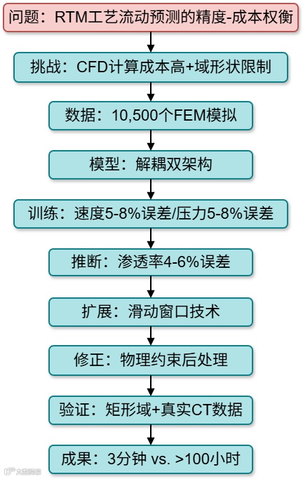 这篇论文发现了复合材料制造中树脂流动预测计算成本过高的真问题。核心硬挑战在于传统数值模拟无法在保证精度的同时实现高效计算,且难以扩展到任意尺寸域。作者提出了基于U-Net的深度学习模型+滑动窗口技术的巧方法,实现了训练集误差5%、验证集误差8%、计算时间从百小时降至3分钟的强效果,带来了物理约束驱动的后处理可实现跨尺度、跨形状预测而无需重新训练的新见解。