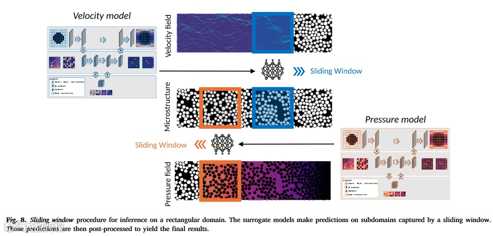 数值模拟预测纤维增强材料中树脂流动存在精度-成本权衡。本研究提出开源深度学习框架,用于任意尺寸单向纤维微观结构的渗透率估计。两个代理模型预测速度场和压力场,训练集误差5%、验证集8%;渗透率推断误差分别为4%和6%。创新性的滑动窗口程序基于物理原理,可预测不同长宽比域的流场,并通过真实μ-CT扫描验证。代码和模型已开源。