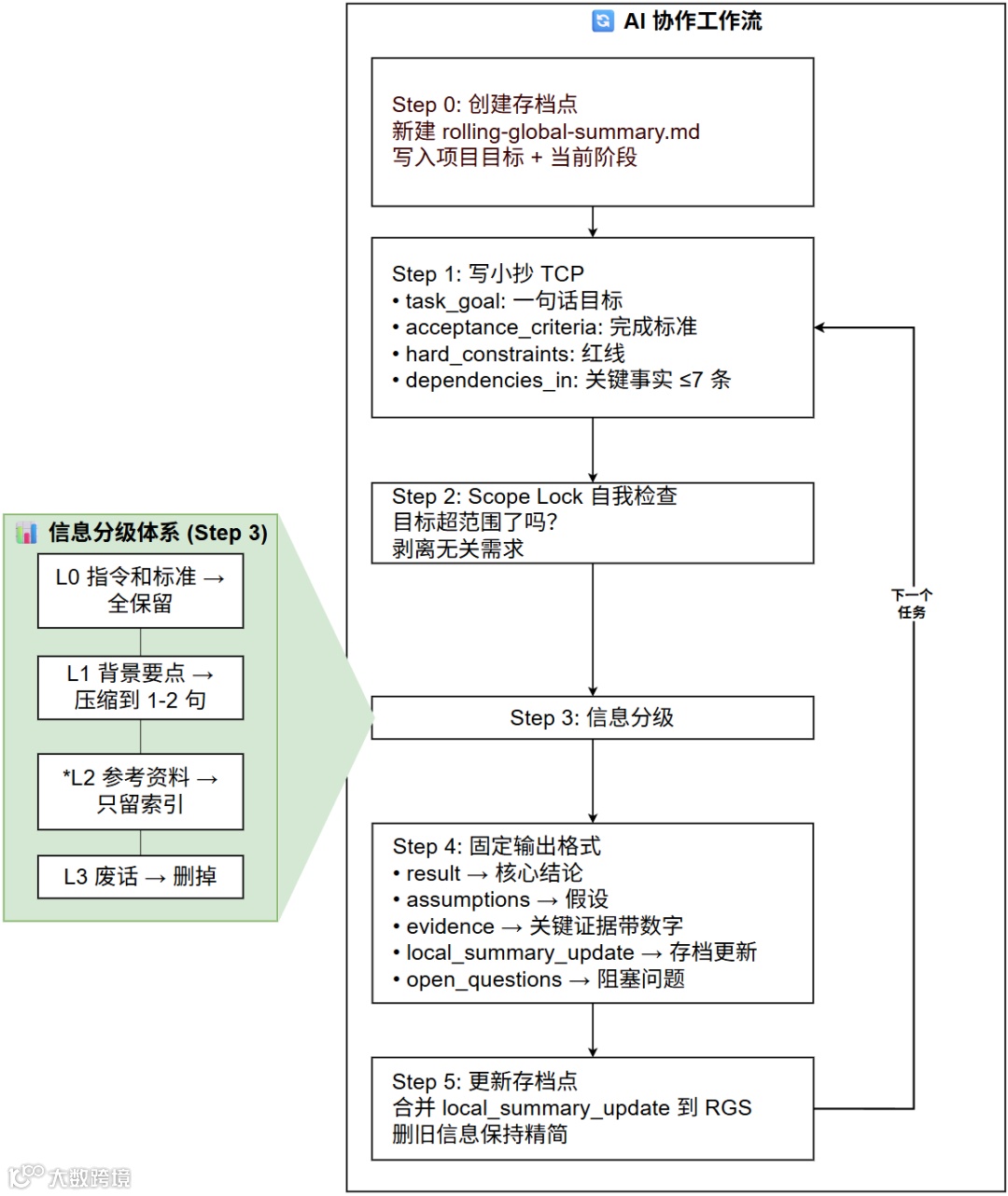Step 0: 创建"存档点"新建一个 rolling-global-summary.md,写入项目目标和当前阶段。