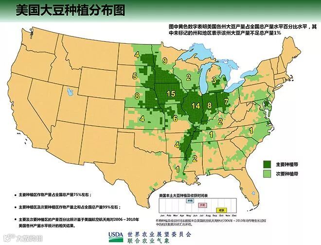 美国大豆种植主要集中在中部平原和密西西比河流域附近,主产州包括伊利诺伊、爱荷华、明尼苏达、印第安纳、内布拉斯加、俄亥俄等18州。
