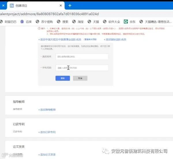 成员的添加方式:在项目详情页创始人简介下面点击蓝字添加团队成员,输入姓名与手机号搜索成员。被搜索的成员须完成第一、二步并通过学历核验。未完善个人信息的成员不能被搜索到,学历核验未通过的成员不能被添加。搜索到之后点击添加发出邀请,被邀请的成员通过关注“全国大学生创业服务网”微信公众号,使用学信网账号登录后同意邀请。同意后,被邀请的成员会出现在项目详情页项目创始人的下列。