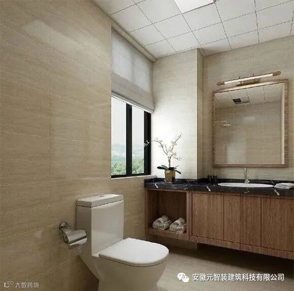 最后再来看看卫生间的设计效果,暖色调的配色设计让卫生间看起来显得特别温暖,黑色大理石浴室柜台面,古铜色化妆镜边框,提升了卫生间整体的装修档次。