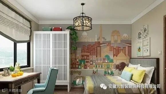 儿童房的设计效果显得不是那么中式,甚至有种混搭的感觉。特别是带图案的墙面,似乎有种异域风情的特点。儿童房的面积不是很大,没有去定制衣柜,而是选择购买成品衣柜来解决收纳的问题,让空间看起来不会太过拥挤。