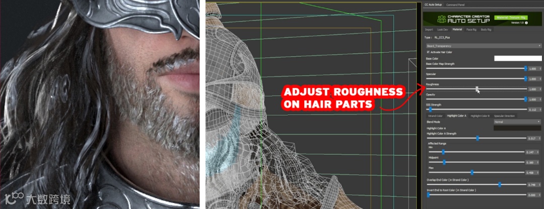现在,毛发材质需要调整以消除那些过于明亮的条纹。幸运的是,通过在材质标签中简单地将粗糙度值设置为大约1.00,这是一个简单的解决方案。对面部毛发也进行了相同的调整。