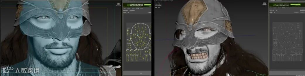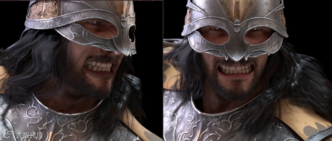 我又重新渲染了一次,皮肤终于变得有凹凸感了。虽然我解决了法线贴图的问题,但我不得不禁用改变面部表情时激活的自动设置皱纹系统,这很遗憾。之后,我把头盔戴回去继续测试。