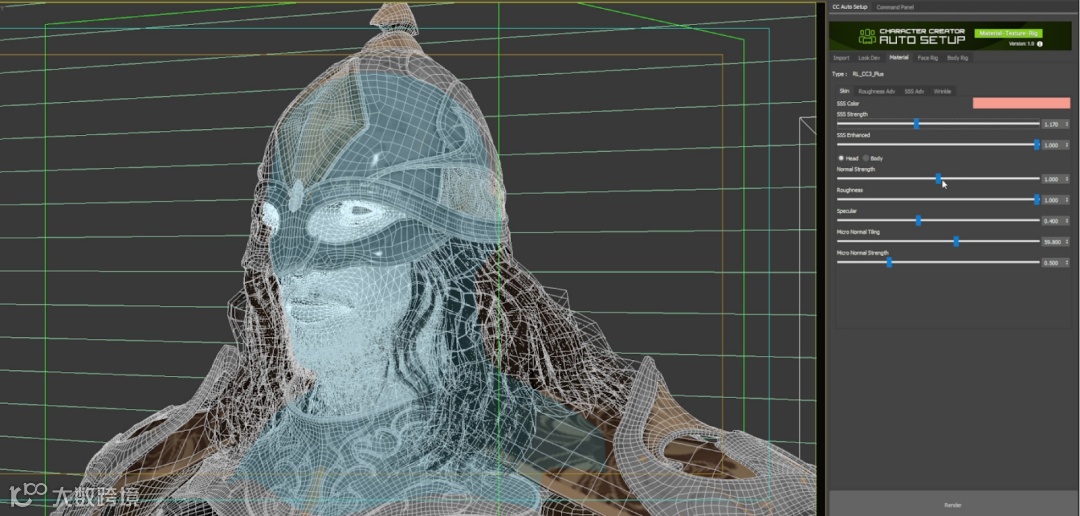 然后,我转到“CC自动设置”窗口中的下一个选项卡。此界面允许我方便地调整材质的属性,而无需访问材质编辑器。例如,有方便的滑块可以修改地下散射(SSS)强度、法线强度、粗糙度等。当我单击角色的头发时,材质选项卡中的滑块会更改为显示与头发相关的设置。相反,单击头部网格会将选项卡中的设置切换到皮肤属性,眼睛、牙齿和舌头也是如此。